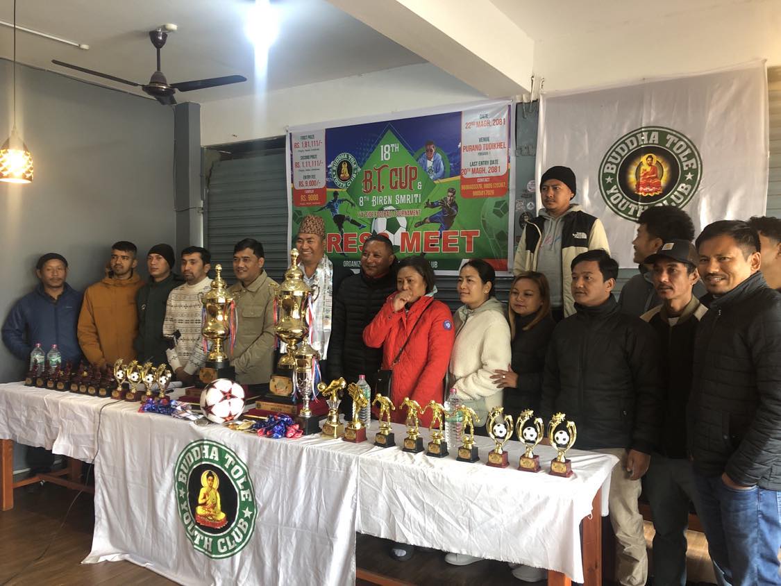 पोखरा, १६ माघ । पोखरा महानगरपालिका–१ टुंडिखेलस्थित खेलमैदानमा यही माघ २२ गतेदेखि आठौं विरेन स्मृति तथा १८ औं बिटी कप सेभेन ए साइड खुल्ला फुटबल प्रतियोगिता आयोजना हुने भएको छ। बुद्धटोल युवा क्लबले आज पत्रकार सम्मेलन गर्दै प्रतियोगिताको सम्पूर्ण तयारी तीव्र पारिएको जानकारी गराएको छ।