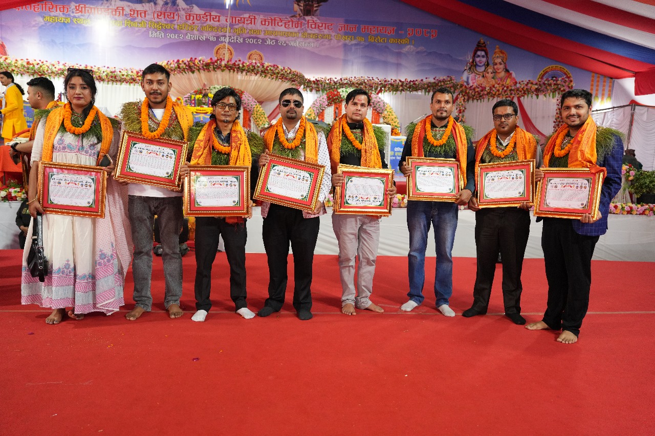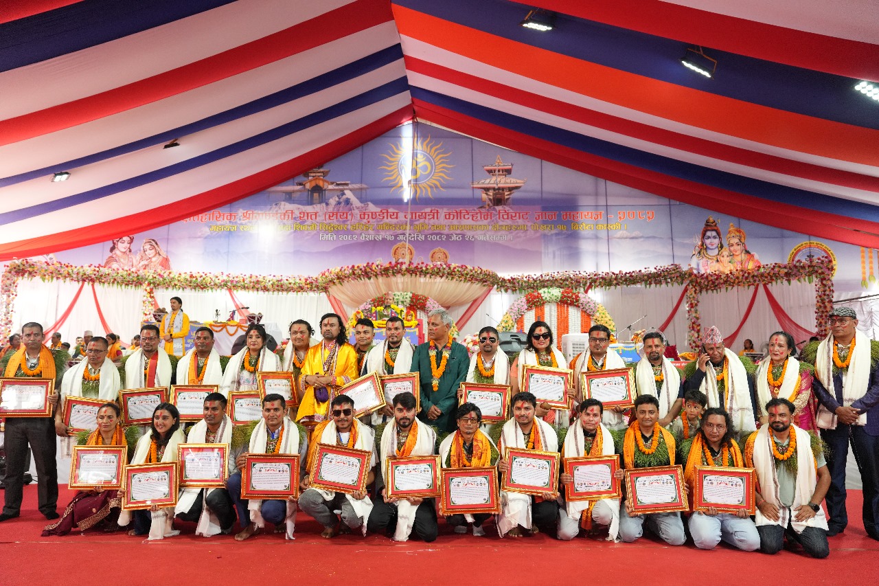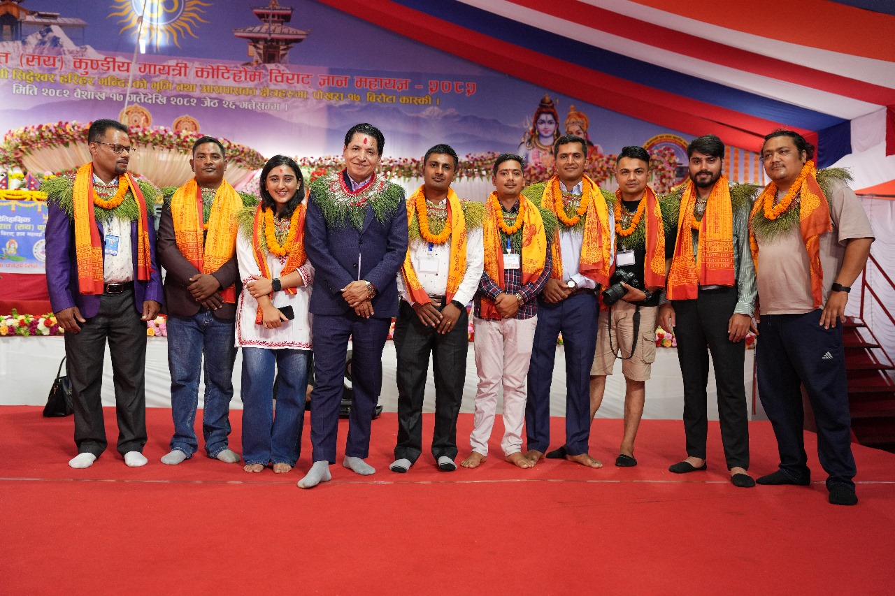 पोखरा, ४ जेठ। पोखरा १७ स्थित सदाशिवजी सिद्देश्वर हरिहर मन्दिर परिसरमा जारी श्री गण्डकी शतकुण्डीय गायत्री कोटिहोम विराट ज्ञान महायज्ञमा देशभरबाट आएका सञ्चारकर्मीलाई विशेष सम्मान गरिएको छ। महायज्ञको प्रचार–प्रसारमा सक्रिय योगदान पुर्‍याएको कदर गर्दै एक सयभन्दा बढी सञ्चारकर्मीलाई कदरपत्र र दोसल्ला ओढाई सम्मान गरिएको हो। महायज्ञ प्रचार–प्रसार संयोजक लेखराज ढकालका अनुसार यो सम्मान कार्यक्रम अझै केही दिनसम्म जारी रहनेछ।